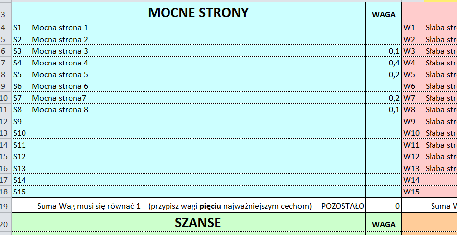 ARKUSZ SWOT – w tym miejscu wpisujesz rozpoznane przez Ciebie czynniki. tj. słabe/mocne strony oraz szanse/zagrożenia. Arkusz pozwala na wpisanie maksymalnie 15 czynników z każdej kategorii. Celem przeprowadzenia poprawnej analizy zastanów się, które z nich są najistotniejsze. Wybierz 5 i w odpowiednim miejscu przypisz wagę, tak aby suma wag dla wszystkich czynników wynosiła 1.