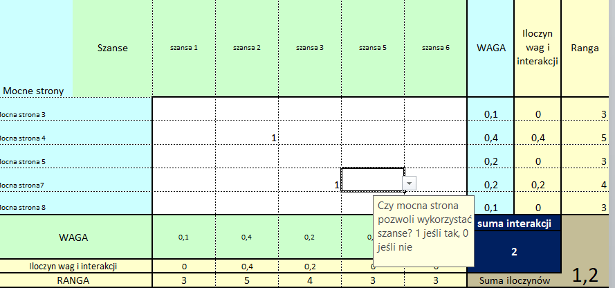 SWOT i TOWS – W tych zakładkach musisz określić, czy zdefiniowane przez Ciebie czynniki oddziałują na siebie. Z listy rozwijanej wybierz 0 lub 1. Arkusz podpowiada na jakie konkretnie pytanie trzeba odpowiedzieć.