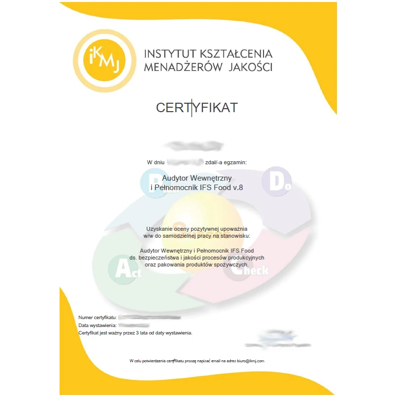 Certyfikat Audytora Wewnętrznego i Pełnomocnika IFS FOOD
