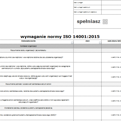 - pytania dotyczące spełnienia wymagań systemu zarządzania środowiskowego wg ISO 14001:2015