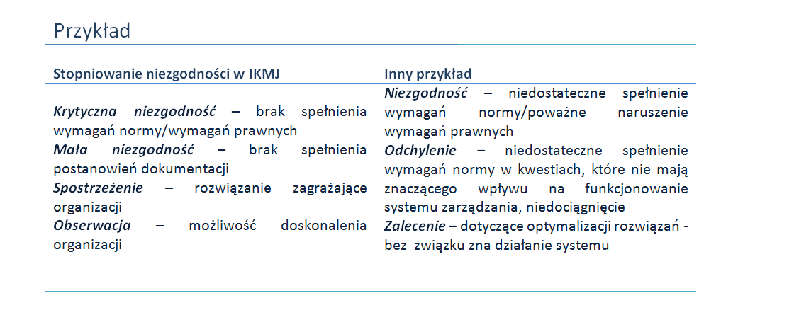 Niezgodność jest to po prostu niespełnienie wymagania. Jednak pamiętajmy, że nie wszystko jest czarne lub białe – dlatego nie proponujemy kategoryzować każdego ustalenia jako zgodny/niezgodny, a co za tym idzie nie wypisywać kart niezgodności za każdą wykrytą błahostkę. Sugerujemy stosować stopniowanie niezgodności.