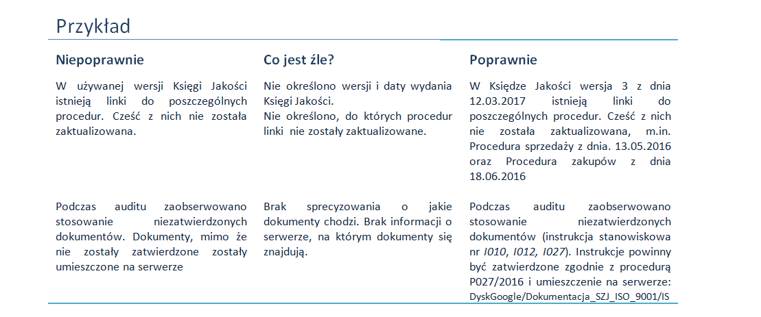 W załączniku III znajduje się jeszcze jeden przykład, tym razem sam raport niezgodności. Pamiętaj, że jest to tylko sugestia i możesz wypracować własny sposób ich odnotowywania.
