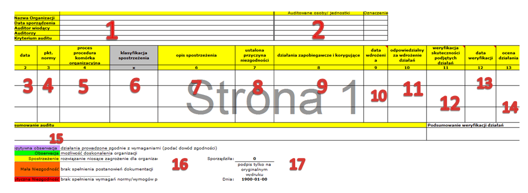 Powyżej znajduje się formularz raportu, który na co dzień stosujemy w naszym Instytucie. Jak widać nie stosujemy osobnego formularza na dokumentowanie niezgodności. Wszelkie obserwacje, zarówno te pozytywne jak i negatywne spisujemy w jednym dokumencie. Dzięki temu nie tworzymy zbędnej papierologii. Poniżej krótko o tym, co zawiera nasz raport.