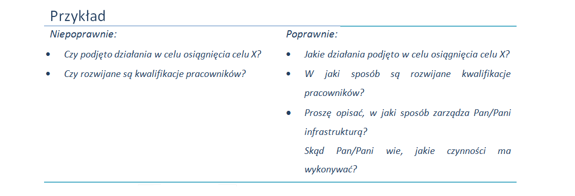 o rozmowie. Otóż prowadzimy ją w godzinach pracy auditowanego. Wyjaśniamy, dlaczego podejmujemy rozmowę oraz informujemy, że będziemy robić notatki. Zwykle rozpoczynamy od prośby o opisanie swojej pracy. Musimy odpowiednio formułować pytania – unikajmy pytań zamkniętych.